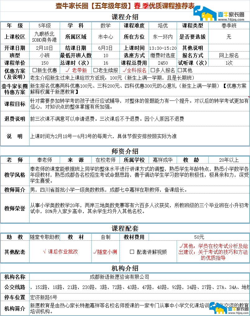 本帖最后由 么么茶 于 2017-2-27 18:18 编辑 壹牛家长圈优质课程推荐五年级数学春季班(周六) 报名或需要到机构试听的,请小窗微微妹(QQ:985052335)和么么茶(QQ:2822179196)欢迎正在参与此课程的家长留 ...