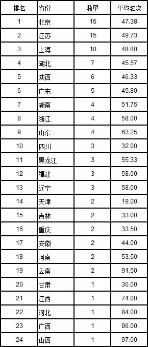 各省2017进入大学综合实力前100名的数量及名次