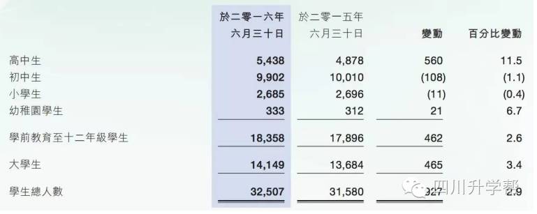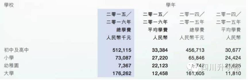 如图所示,初高中学费占比最大,2015-2016年学年初中及高中的总学费为5.12亿,每人平均3.3万,大学反而是最低的,平均每人1.2万。对比两个学年,德瑞系的各阶段学费都有上涨,尤其是小学、初高中一学年涨了近3000元。